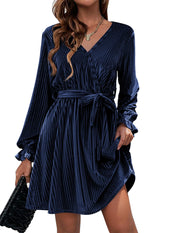 Step out in style with this elegant women’s velvet wrap dress, featuring a flattering V-neckline, flared long lantern sleeves, and a chic self-tie belt that accentuates your waist. Crafted from soft, luxurious velvet fabric, this dress offers both comfort and sophistication, making it perfect for cocktail parties, evening events, and special occasions.