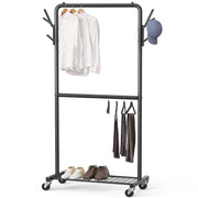 Double Rod Garment Rack with Wheels, Hooks Bottom Shelves